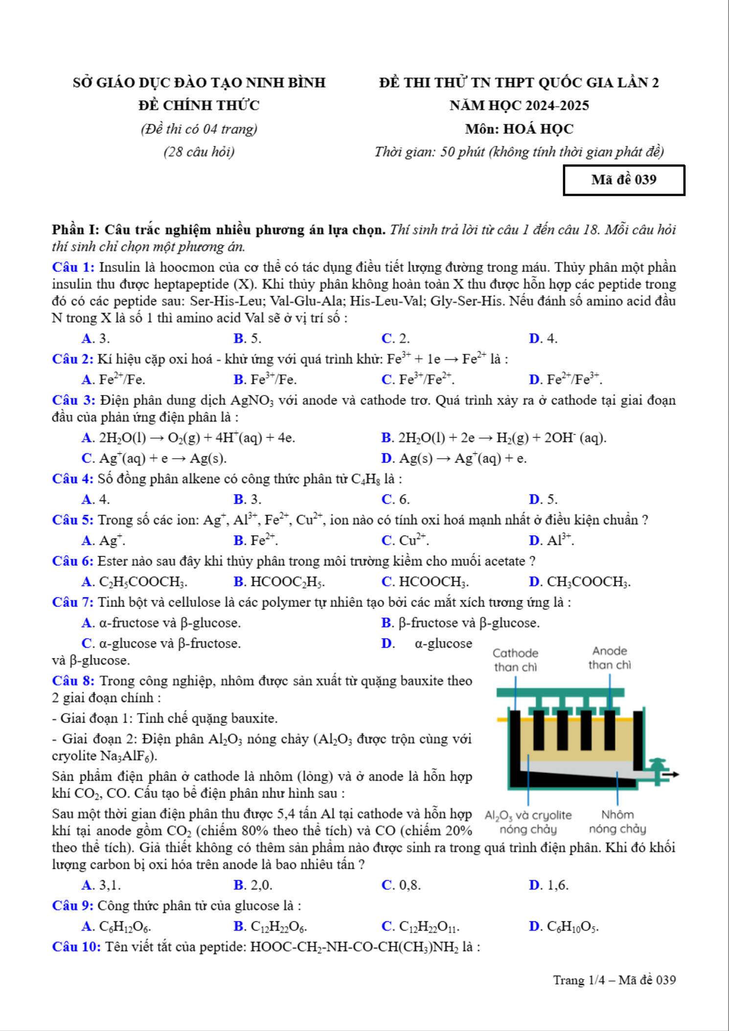 Đề thi thử tốt nghiệp THPT 2025 môn Hóa lần 2 Sở GD&ĐT Ninh Bình