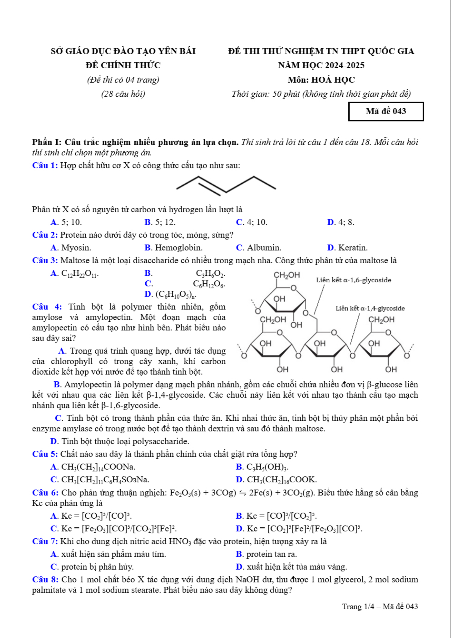 Đề thi thử tốt nghiệp THPT 2025 môn Hóa Sở GD&ĐT Yên Bái