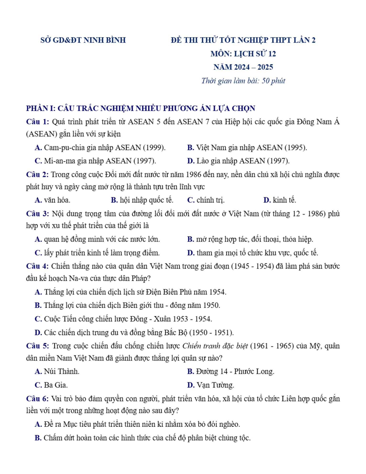 Đề thi thử tốt nghiệp môn Sử lần 2 Sở Ninh Bình