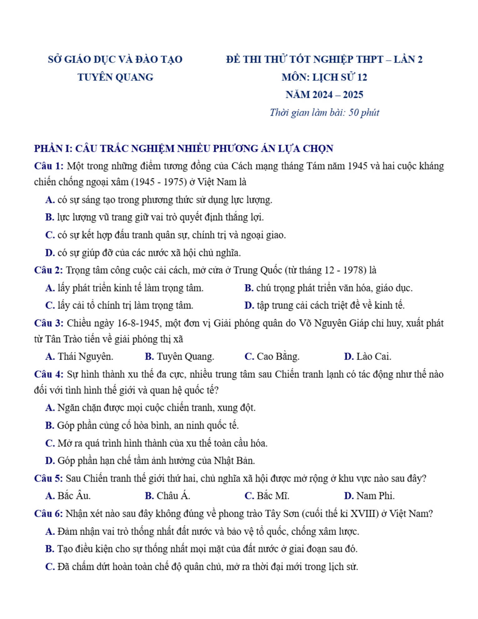 Đề thi thử tốt nghiệp THPT 2025 môn Lịch sử lần 2 Sở GD&ĐT Tuyên Quang
