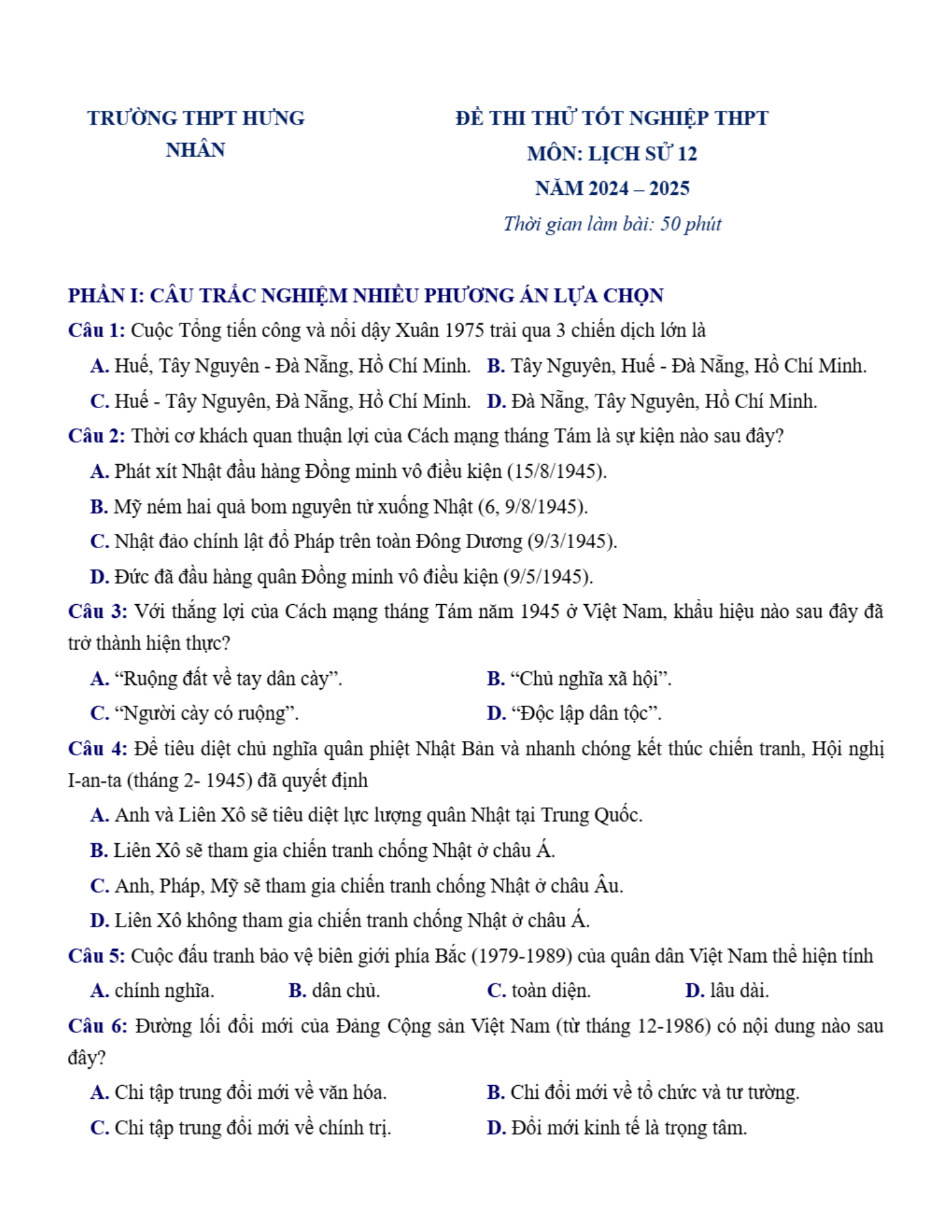 Đề thi thử tốt nghiệp THPT 2025 môn Lịch sử trường THPT Hưng Nhân, Thái Bình