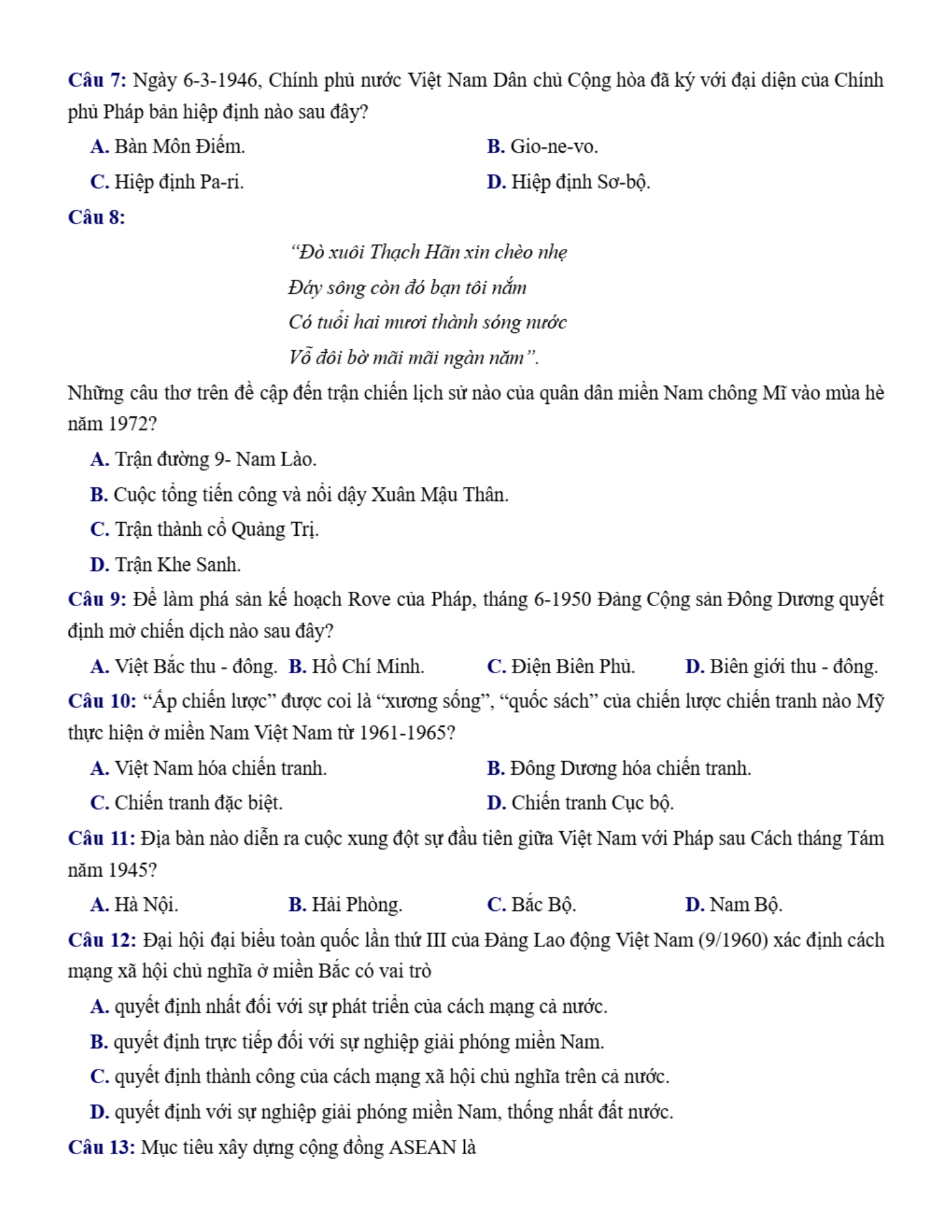 Đề thi thử tốt nghiệp môn Sử trường Hưng Nhân, Thái Bình