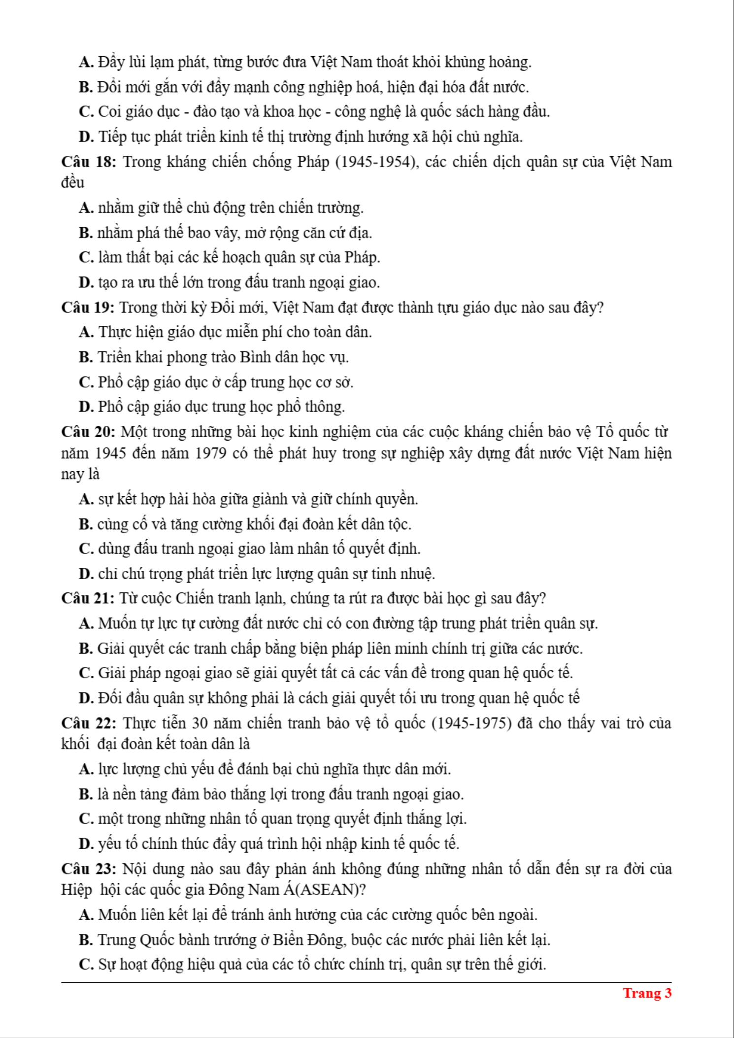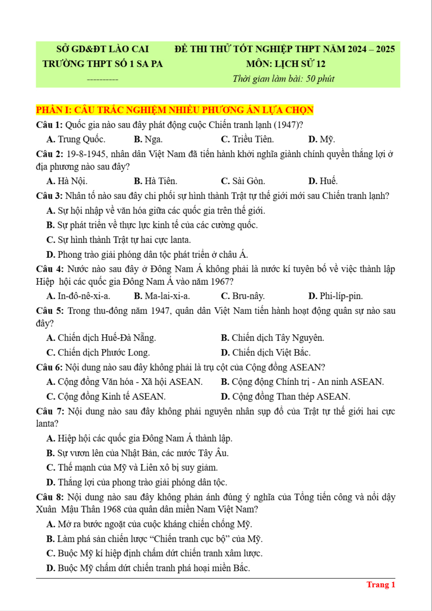 Đề thi thử tốt nghiệp môn Sử trường số 1 Sa Pa, Lào Cai