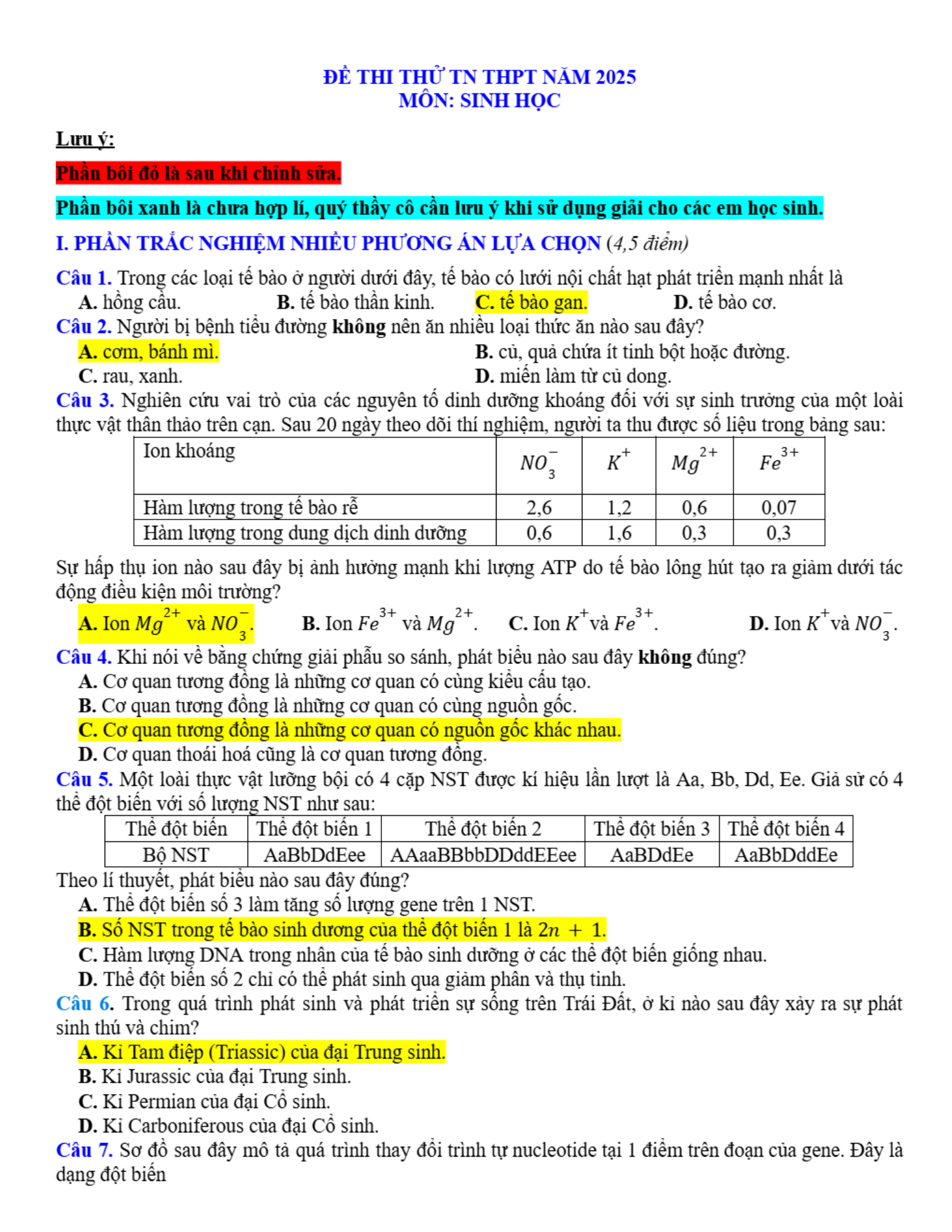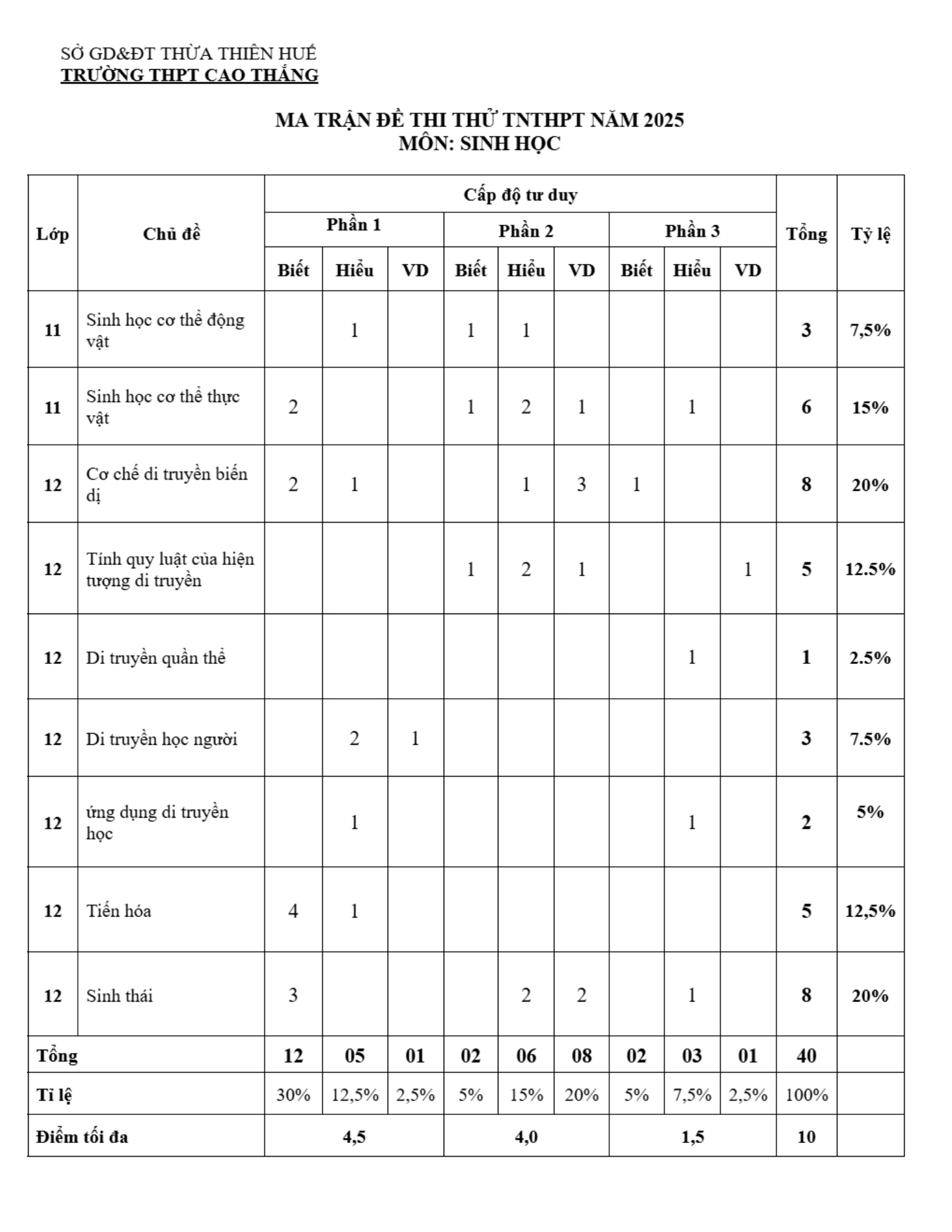 Đề thi thử tốt nghiệp THPT 2025 môn Sinh học trường THPT Cao Thắng, Huế