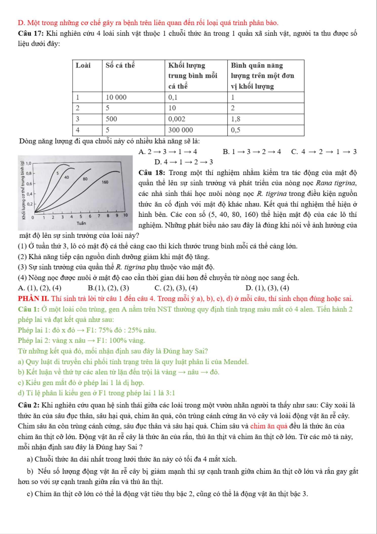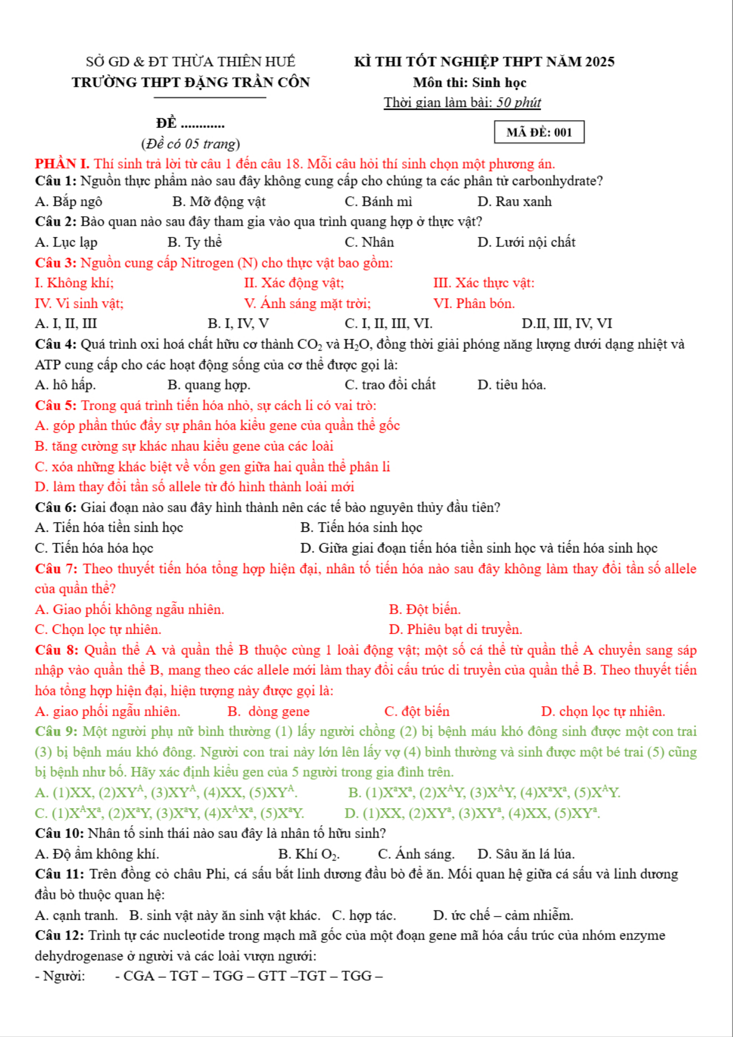 Đề thi thử tốt nghiệp THPT Quốc gia 2025 môn Sinh học trường THPT Đặng Trần Côn, Huế có đáp án là tài liệu hữu ích giúp bạn đọc có thêm tài liệu ôn thi kì Thi THPT Quốc gia sắp tới nhé. Đề thi gồm có 18 câu hỏi trắc nghiệm nhiều phương án lựa chọn, 4 câu hỏi trắc nghiệm đúng sai và 6 câu hỏi trắc nghiệm trả lời ngắn. Thí sinh làm bài trong thời gian 50 phút. Đề có đáp án và lời giải chi tiết kèm theo. Mời các bạn cùng theo dõi chi tiết đề thi dưới đây.