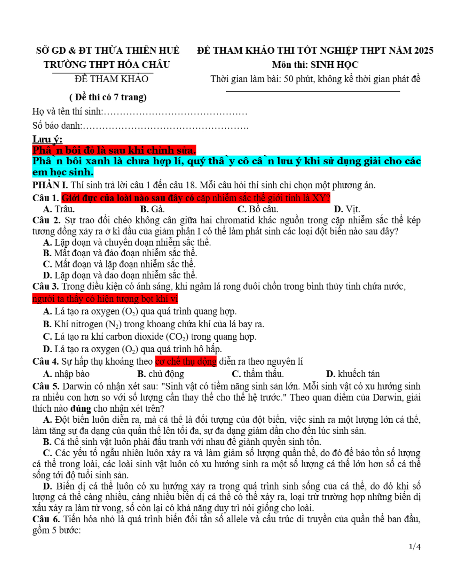 Đề thi thử tốt nghiệp THPT 2025 môn Sinh học trường THPT Hóa Châu, Huế