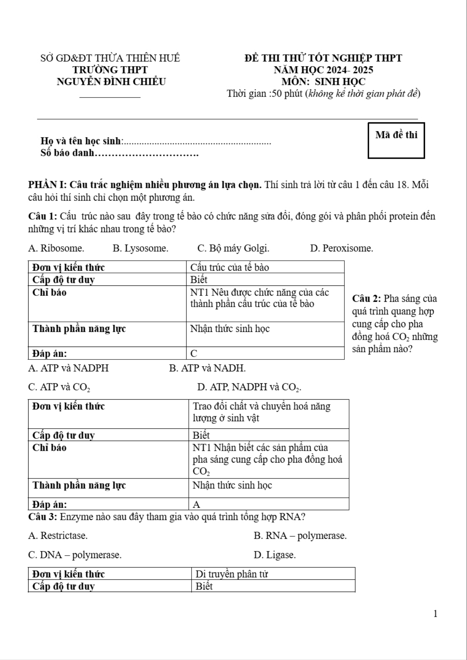 Đề thi thử tốt nghiệp THPT 2025 môn Sinh học trường THPT Nguyễn Đình Chiểu, Huế