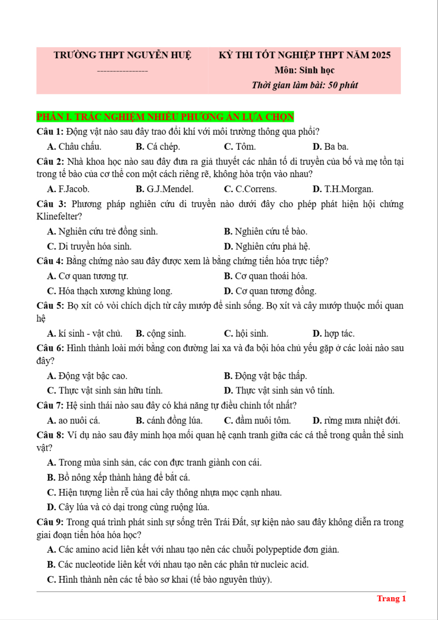 Đề thi thử tốt nghiệp THPT Quốc gia 2025 môn Sinh học trường THPT Nguyễn Huệ có đáp án là tài liệu hữu ích giúp bạn đọc có thêm tài liệu ôn thi kì Thi THPT Quốc gia sắp tới nhé. Đề thi được biên soạn theo cấu trúc đề thi mới. Đề thi gồm có 18 câu hỏi trắc nghiệm nhiều phương án lựa chọn, 4 câu hỏi trắc nghiệm đúng sai và 6 câu hỏi trắc nghiệm trả lời ngắn. Thí sinh làm bài trong thời gian 50 phút. Đề có đáp án và lời giải chi tiết kèm theo. Mời các bạn cùng theo dõi chi tiết đề thi dưới đây.