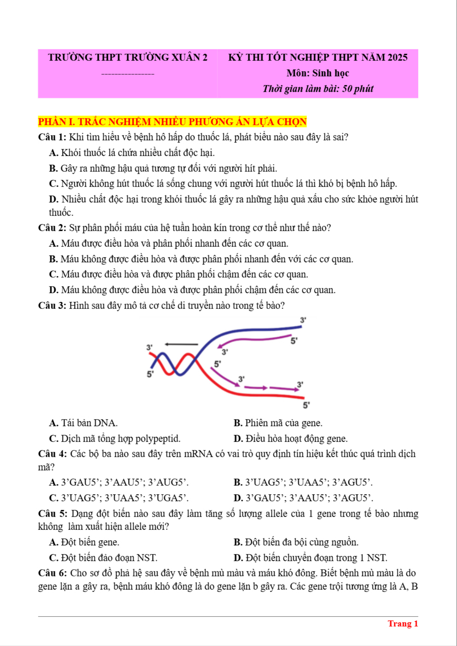 Để giúp bạn đọc có thêm tài liệu ôn thi kì Thi THPT Quốc gia sắp tới, VnDoc.com xin gửi tới bạn đọc bài viết Đề thi thử tốt nghiệp THPT Quốc gia 2025 môn Sinh học trường THPT Trường Xuân 2, Thanh Hóa có đáp án để bạn đọc cùng theo dõi. Đề thi gồm có 18 câu hỏi trắc nghiệm nhiều phương án lựa chọn, 4 câu hỏi trắc nghiệm đúng sai và 6 câu hỏi trắc nghiệm trả lời ngắn. Thí sinh làm bài trong thời gian 50 phút. Đề có đáp án và lời giải chi tiết kèm theo. Mời các bạn cùng theo dõi chi tiết đề thi dưới .