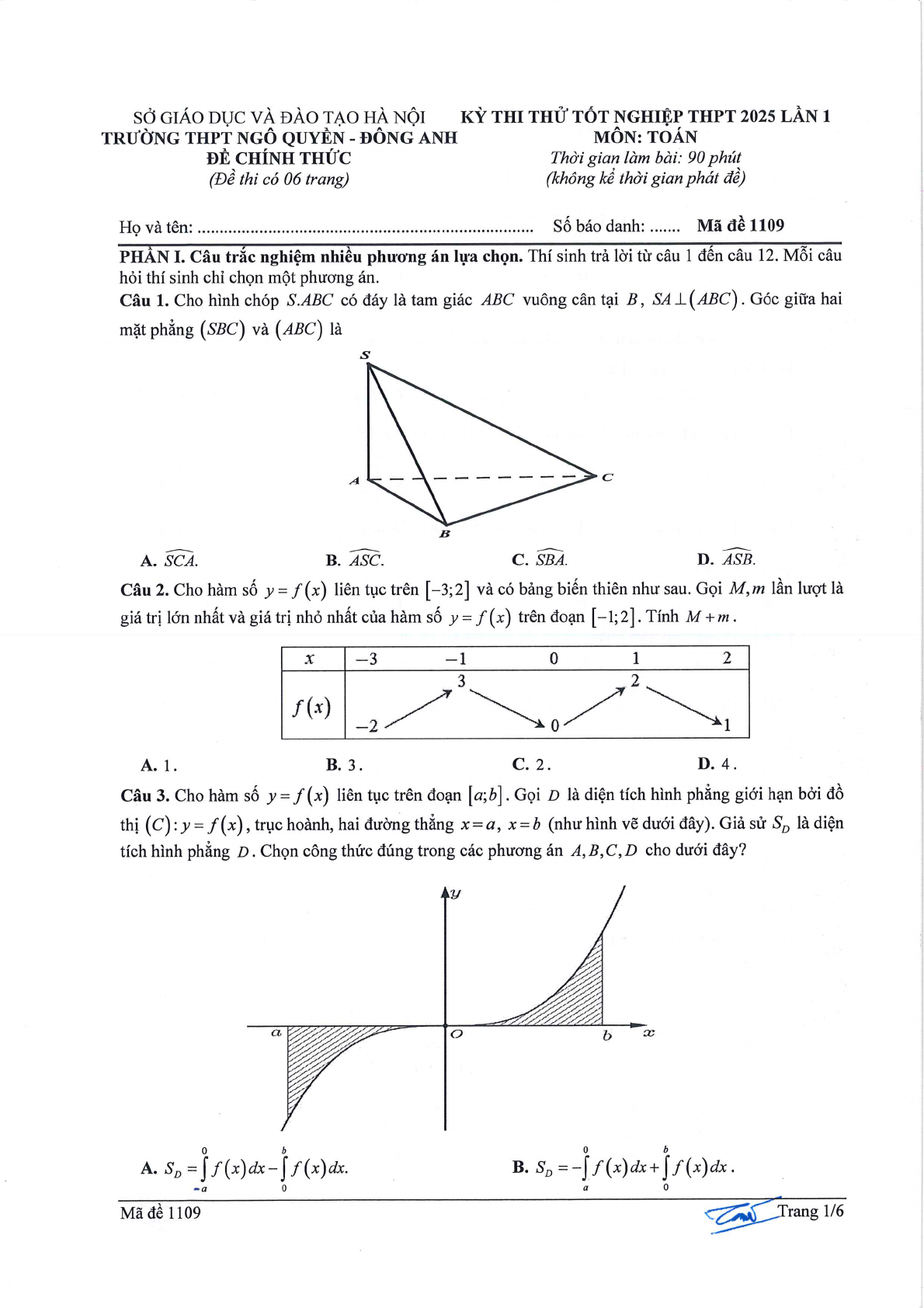 Đề thi thử tốt nghiệp THPT 2025 môn Toán lần 1 trường THPT Ngô Quyền, Hà Nội