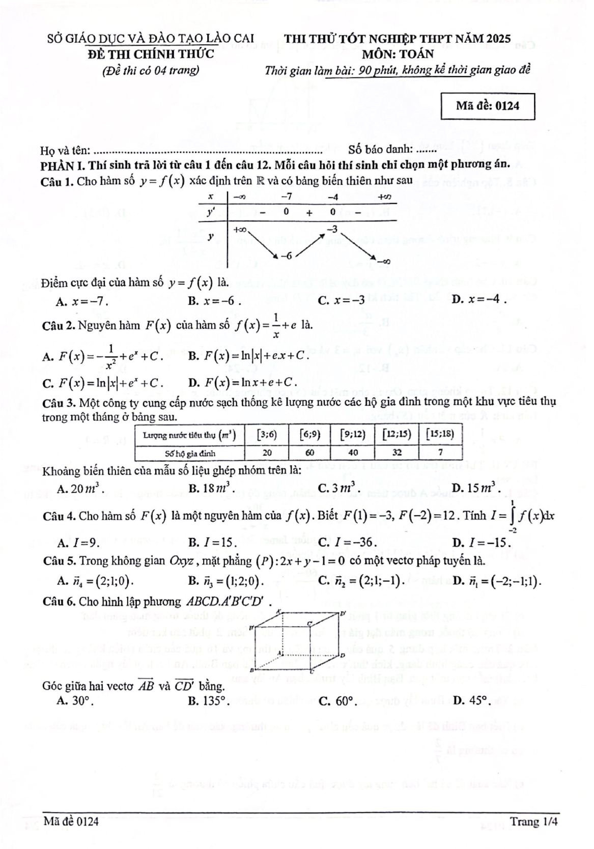 Đề thi thử tốt nghiệp THPT 2025 môn Toán Sở GD&ĐT Lào Cai