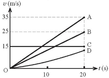 Câu 10. Hình vẽ mô tả đồ thị (v – t) của bốn xe ô tô A, B, C, D. Nhận định nào sau đây là đúng?