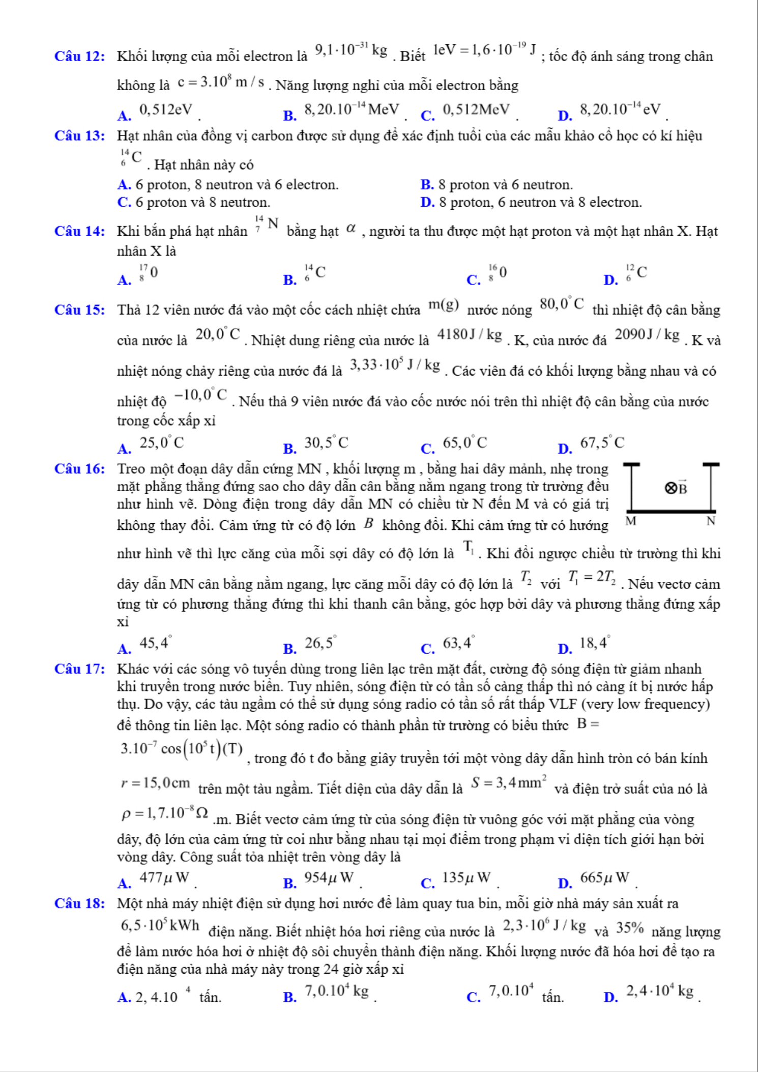 Đề thi thử tốt nghiệp môn Lý trường Lương Thế Vinh, Hà Nội