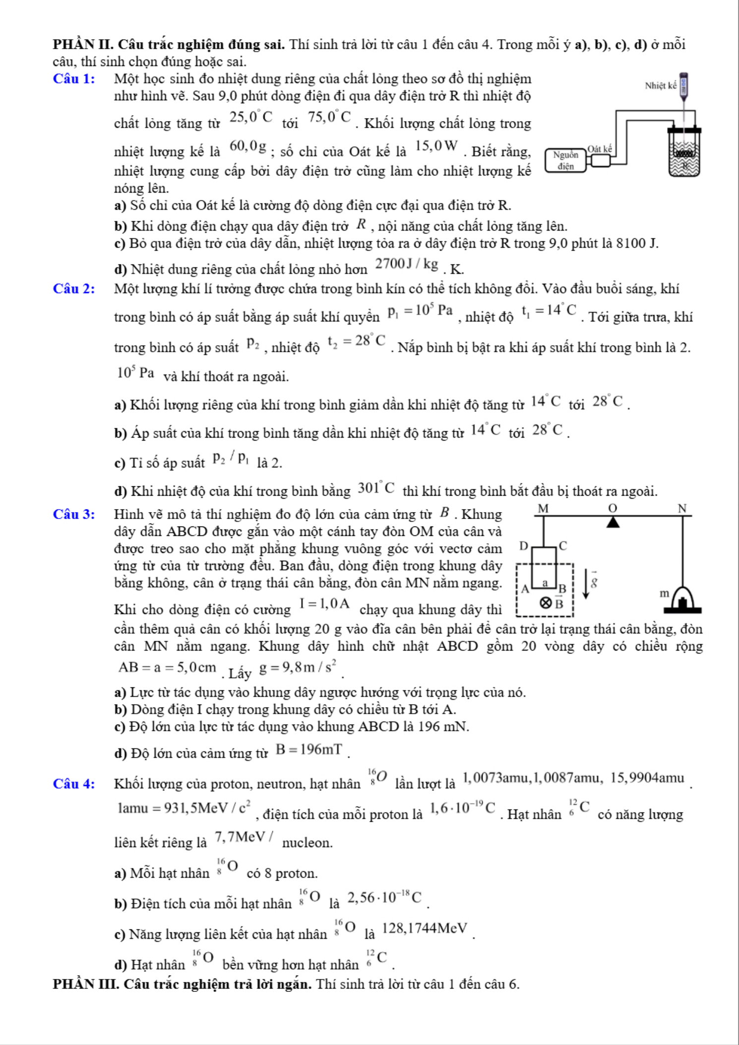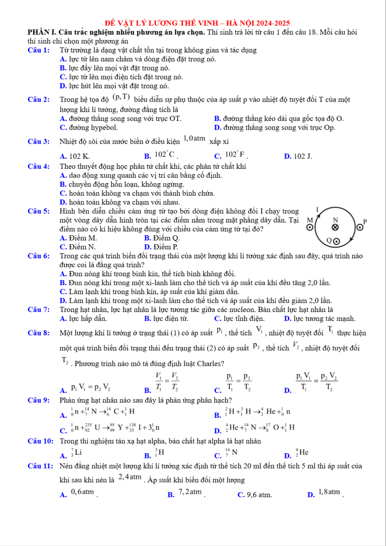 VnDoc.com xin gửi tới bạn đọc bài viết Đề thi thử tốt nghiệp THPT Quốc gia 2025 môn Vật lí trường THPT Lương Thế Vinh, Hà Nội có đáp án. Đề thi được biên soạn theo cấu trúc đề thi mới. Đề thi gồm có 18 câu hỏi trắc nghiệm nhiều phương án lựa chọn, 4 câu hỏi trắc nghiệm đúng sai và 6 câu hỏi trắc nghiệm trả lời ngắn. Thí sinh làm bài trong thời gian 50 phút. Đề có đáp án và lời giải chi tiết kèm theo. Mời các bạn cùng theo dõi đề thi dưới đây để có thêm tài liệu ôn thi kì Thi THPT Quốc gia nhé.