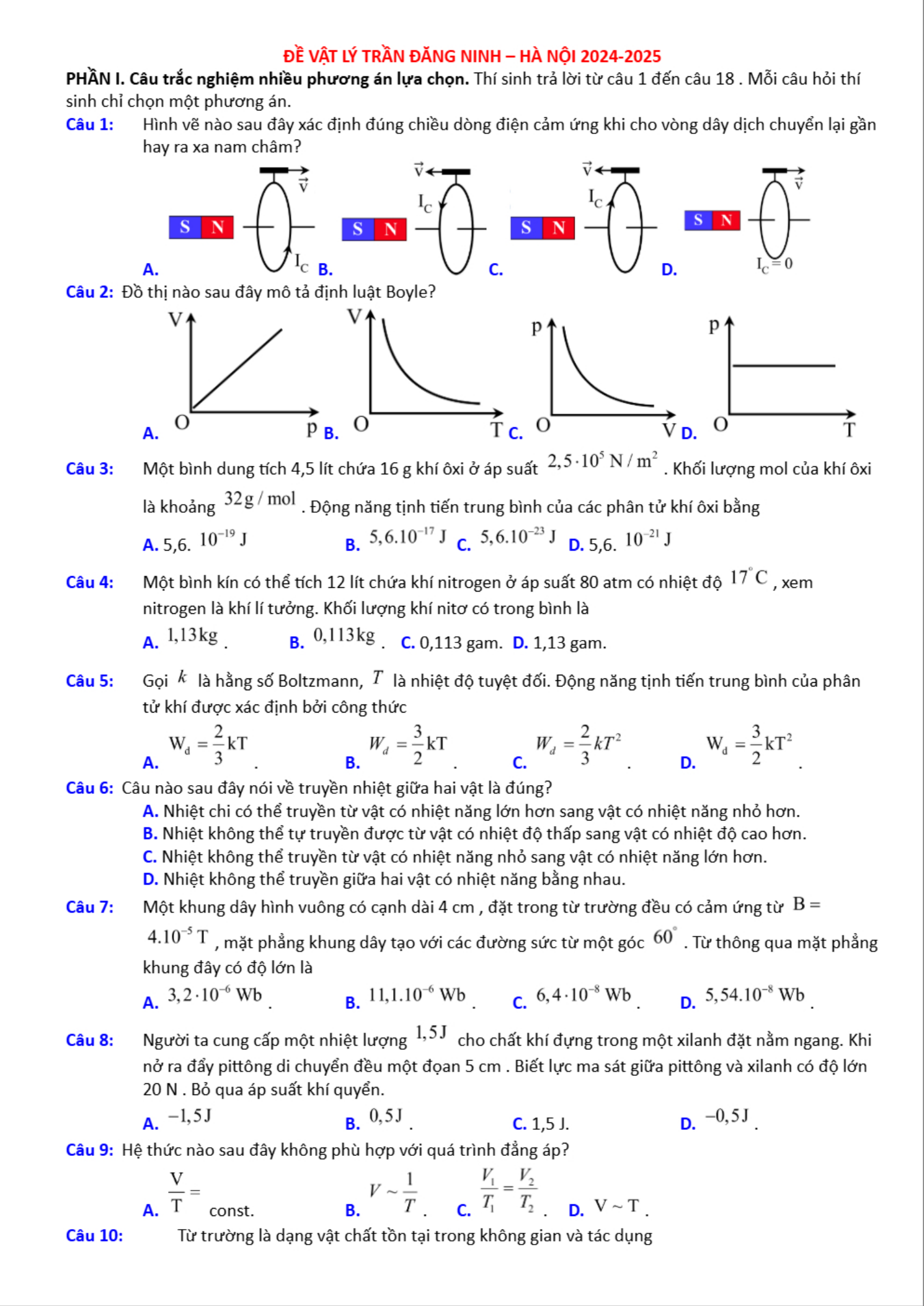 Đề thi thử tốt nghiệp môn Lý trường Trần Đăng Ninh, Hà Nội