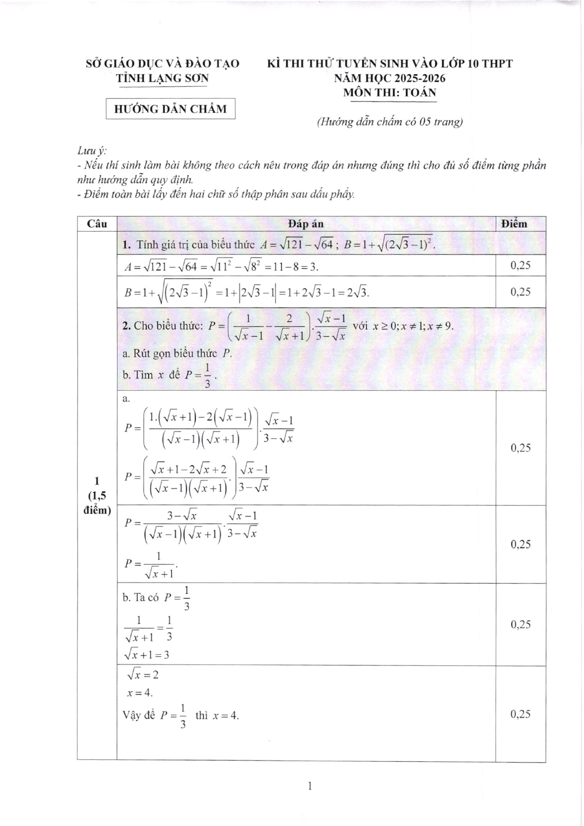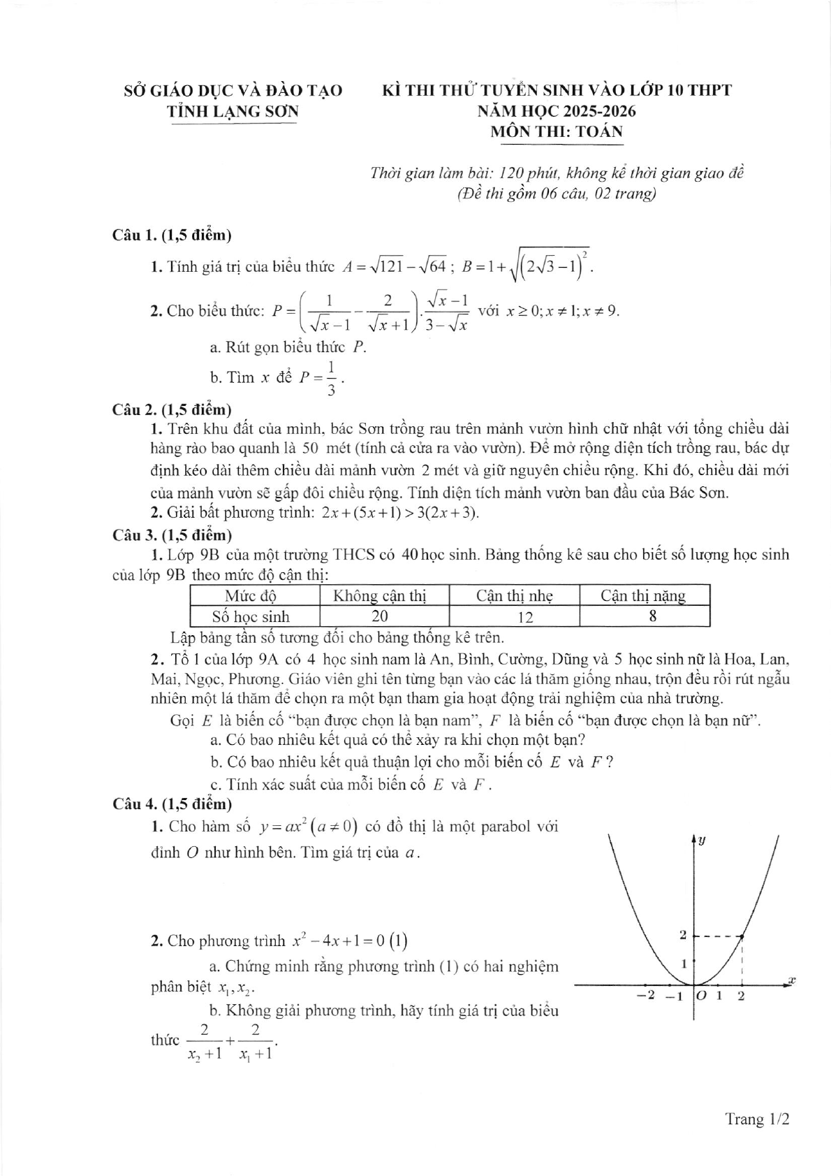 Đề thi thử tuyển sinh lớp 10 môn Toán sở GD&ĐT Lạng Sơn năm 2025 - 2026