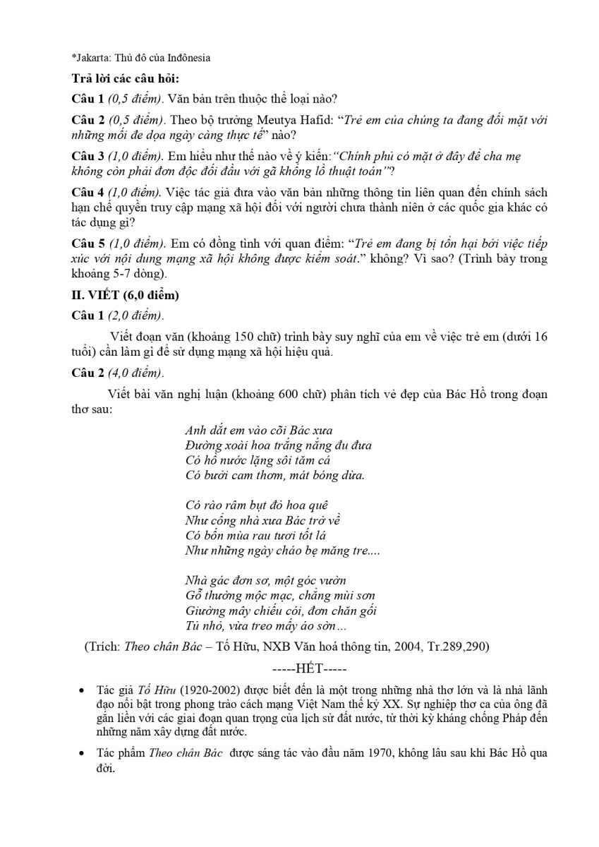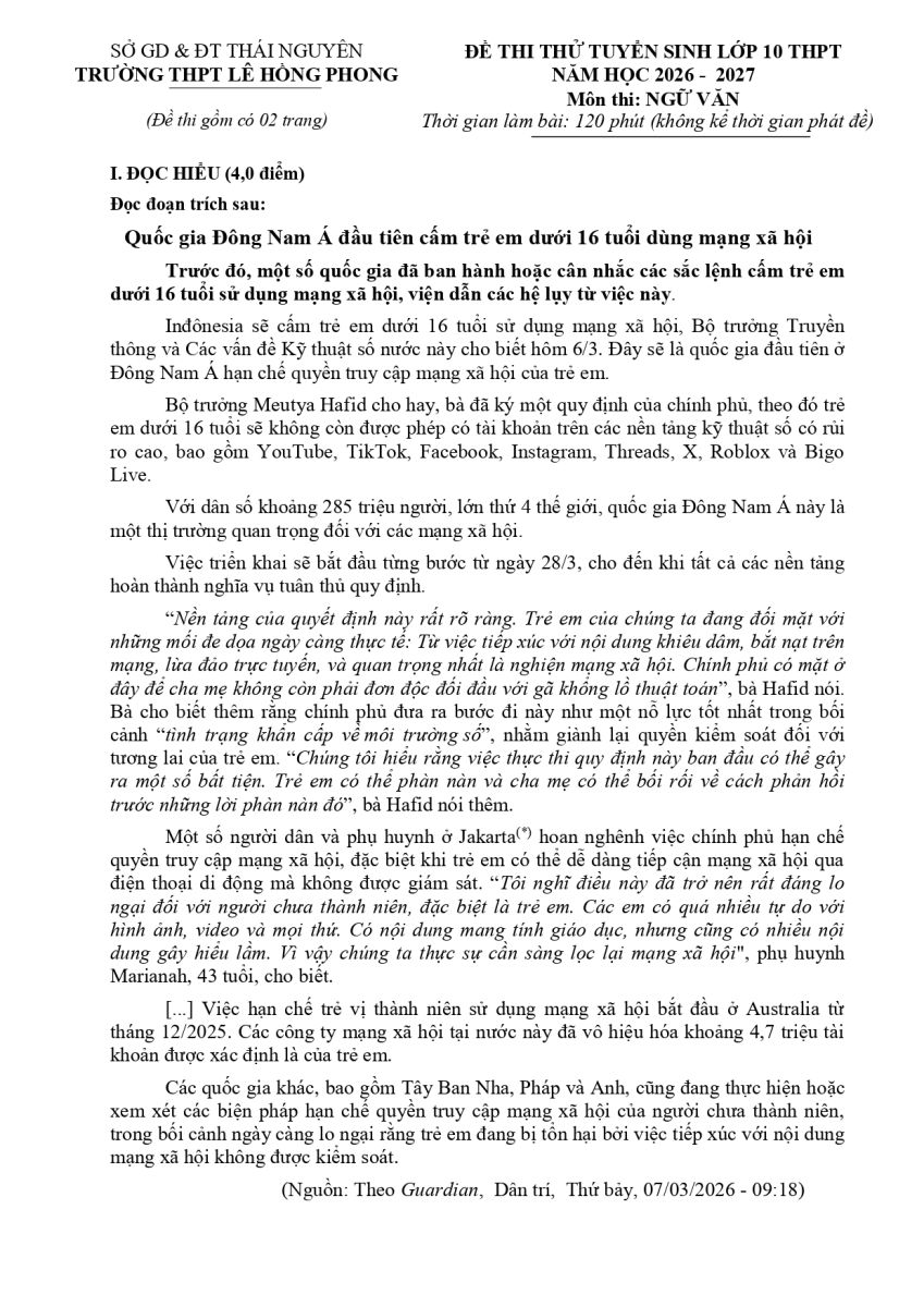 2. Đề thi thử lớp 10 môn Văn trường THPT Lê Hồng Phong, Thái Nguyên năm 2025 - 2026