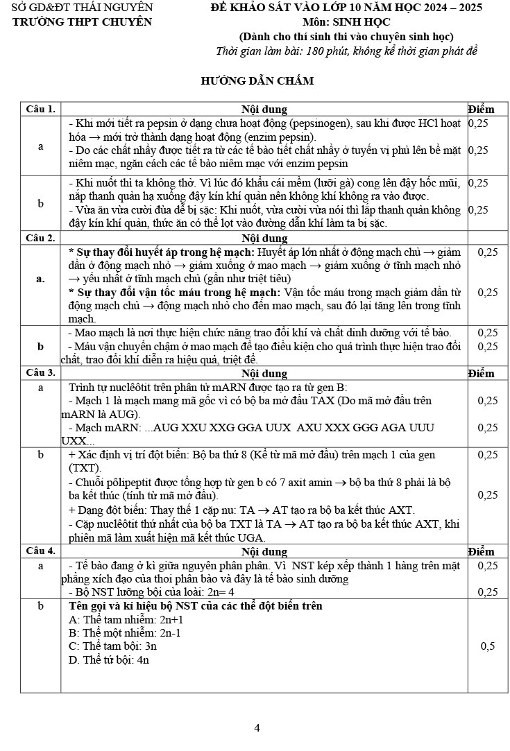 Đề thi thử vào lớp 10 chuyên Sinh 2024 Chuyên Thái Nguyên có đáp án và thang điểm dành riêng cho các em thử sức trước kỳ thi tuyển sinh lớp 10 năm nay. Đề thi thử chuyên Sinh này gồm có 10 câu hỏi tương ứng với thang điểm 10 điểm. Các em hãy thử tập trung làm bài hiểu rõ yêu cầu và thực hiện làm đề thi này trong 180 phút.