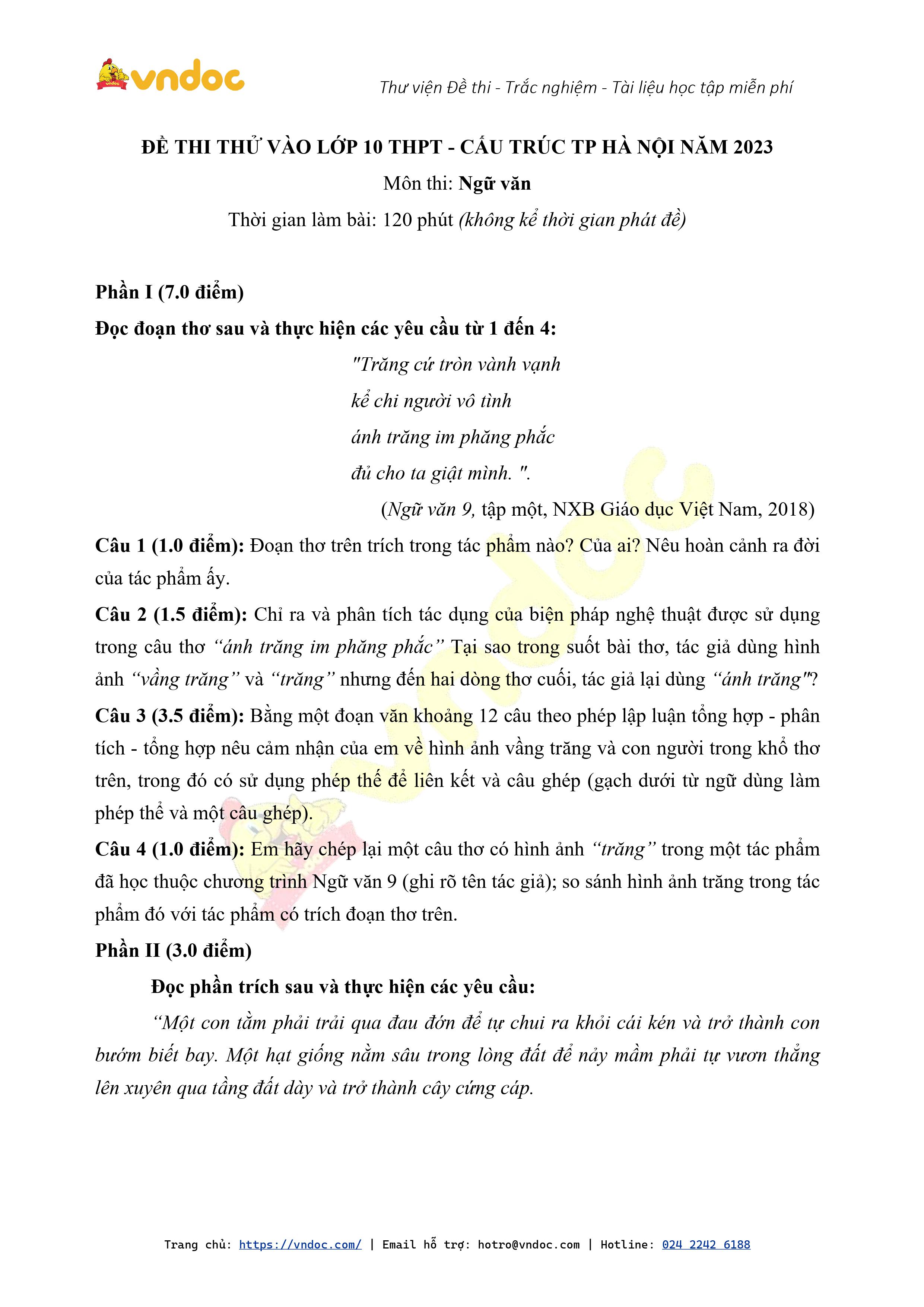 Đề thi thử vào lớp 10 môn Ngữ văn 2023 (cấu trúc đề TP Hà Nội) - Đề 4