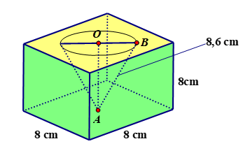 Câu 13. (1,0 điểm) Một khối gỗ hình lập phương cạnh 8 cm, được khoét bởi một hình nón, đường sinh AB = 8,6 cm. và đỉnh chạm mặt đáy của khối gỗ (xem hình bên).