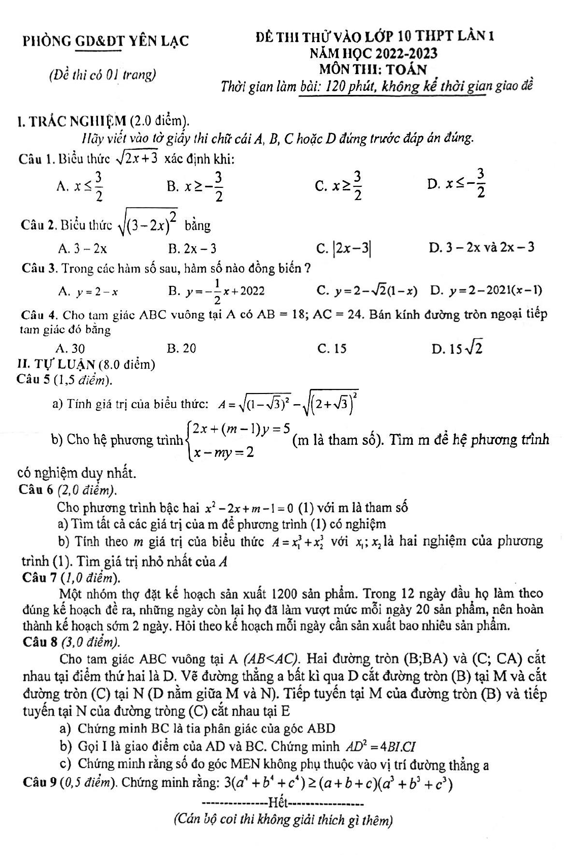 Đề thi tuyển sinh lớp 10 môn Toán lần 1 phòng GD&ĐT Yên Lạc, Vĩnh Phúc năm học 2022-2023