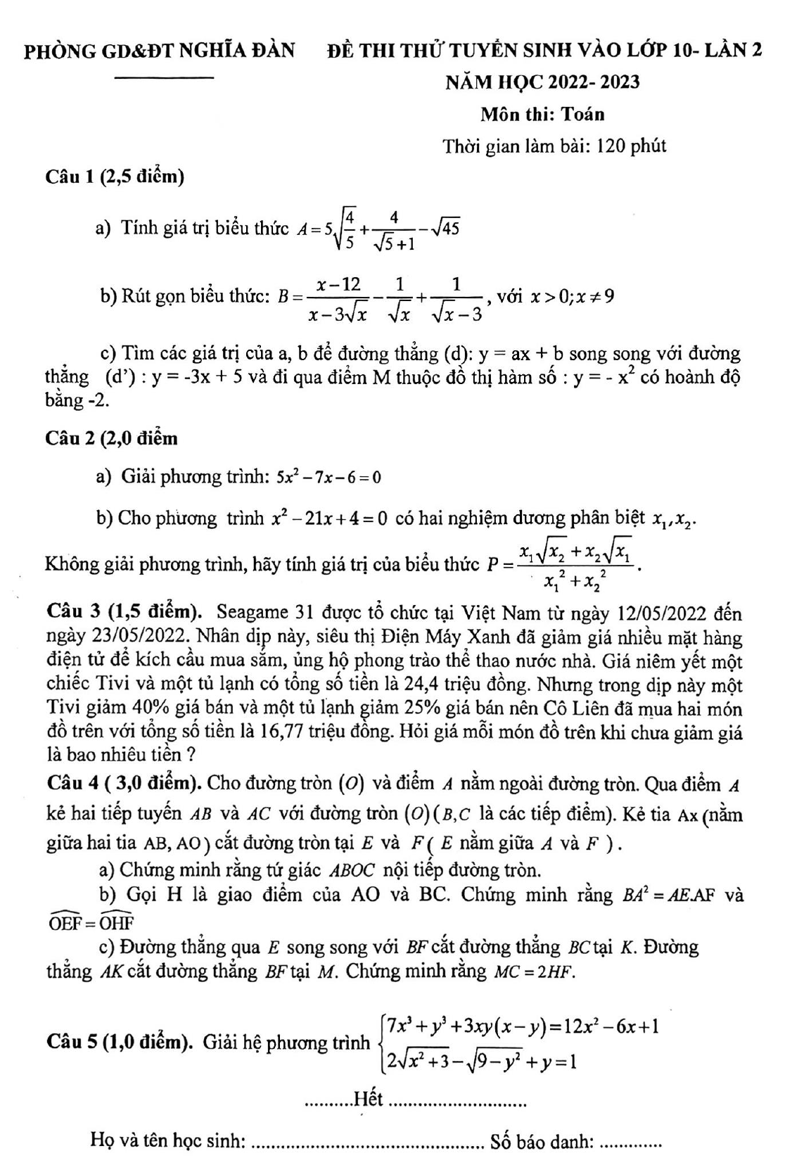 Đề thi thử vào lớp 10 môn Toán lần 2 phòng GD&ĐT Nghĩa Đàn, Nghệ An năm học 2022-2023