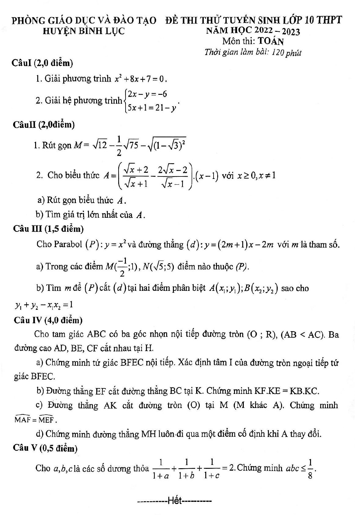 Đề thi thử vào lớp 10 môn Toán phòng GD&ĐT Bình Lục, Hà Nam năm học 2022-2023