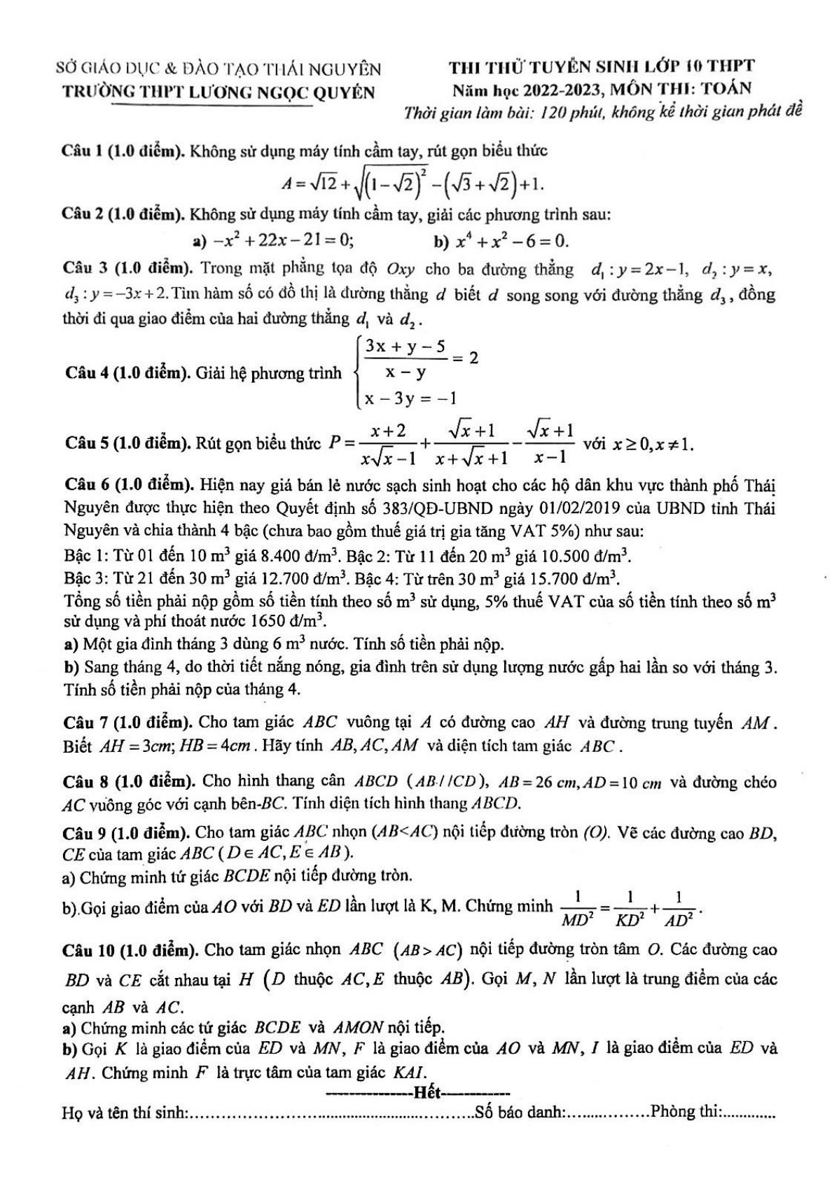 Đề thi thử vào lớp 10 môn Toán trường Lương Ngọc Quyến, Thái Nguyên năm học 2022-2023