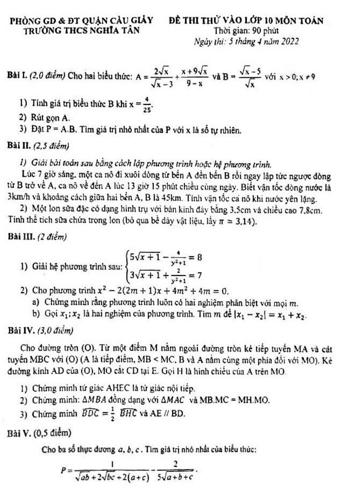 Đề thi thử vào lớp 10 môn Toán trường THCS Nghĩa Tân, Hà Nội năm 2022