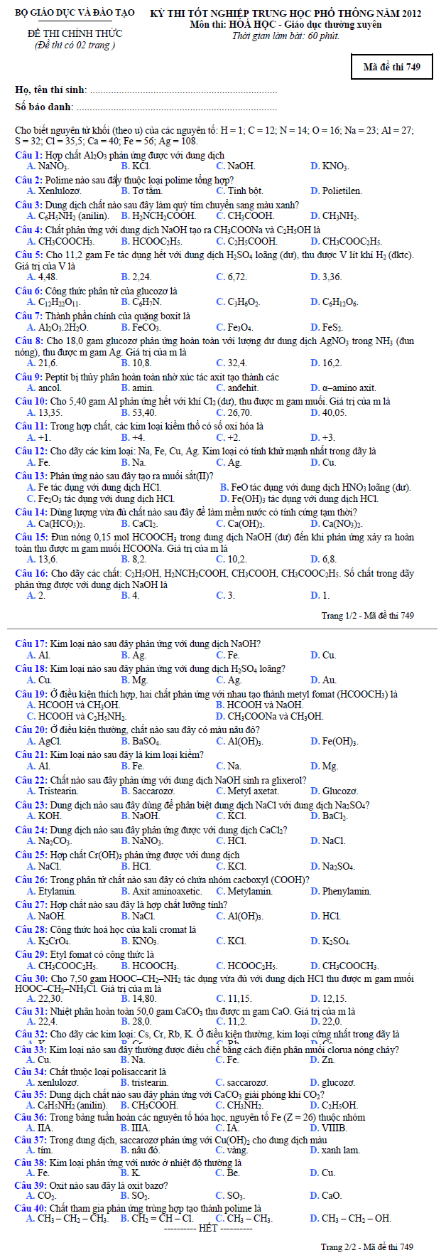 Đề thi tốt nghiệp THPT môn Hóa học theo hình thức trắc nghiệm dành cho hệ Giáo dục thường xuyên năm học 2012 - Mã đề thi 749