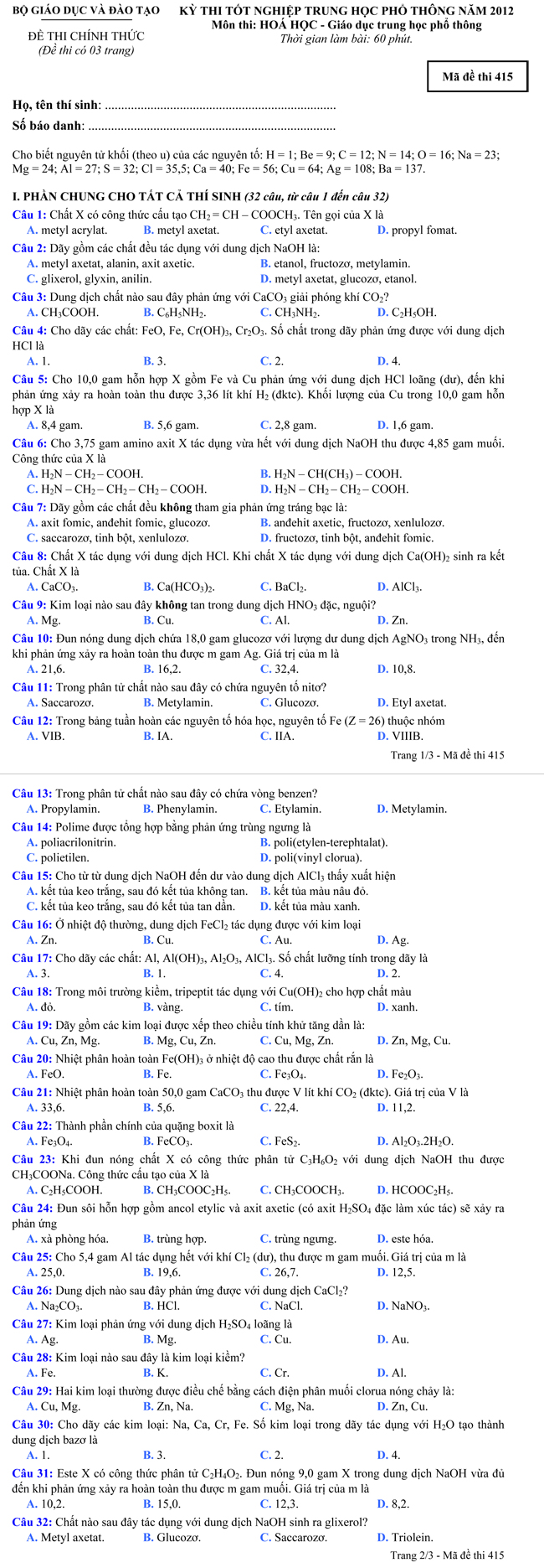 Đề thi tốt nghiệp THPT môn Hóa học hệ Phổ thông theo hình thức trắc nghiệm năm 2012 - Mã đề thi 415