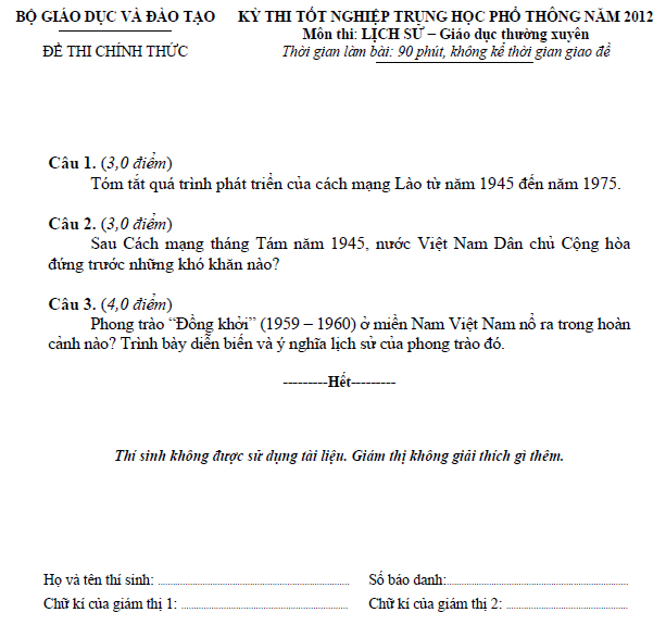 Đề thi tốt nghiệp THPT môn Lịch Sử hệ Giáo dục thường xuyên năm 2012