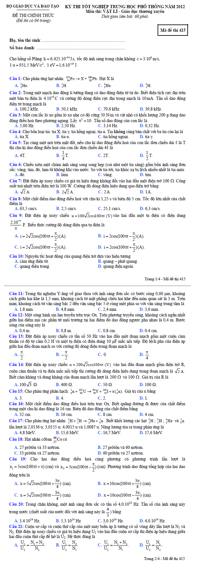 Đề thi tốt nghiệp THPT môn Vật Lí hệ Giáo dục thường xuyên 2012 - Mã đề 415