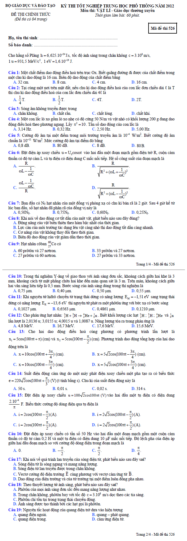 Đề thi tốt nghiệp THPT môn Vật Lí hệ Giáo dục thường xuyên 2012 - Mã đề 526