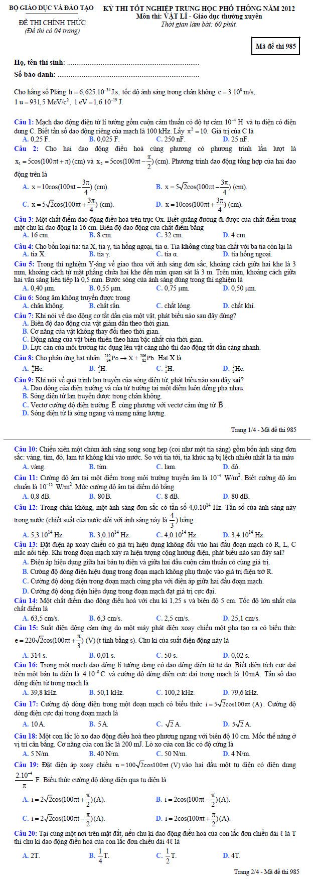 Đề thi tốt nghiệp THPT môn Vật lí dành cho hệ Giáo dục thường xuyên năm học 2012 - Mã đề thi 985