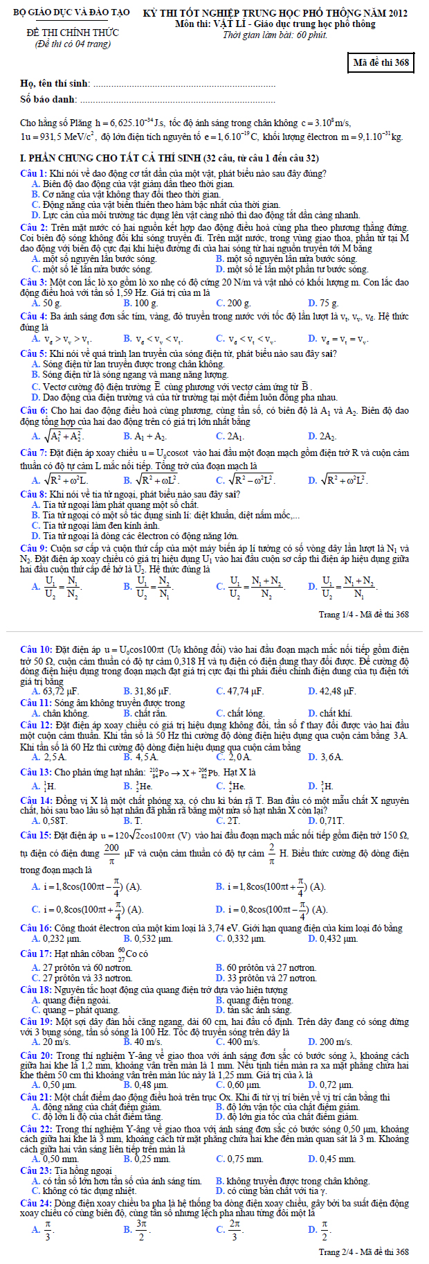 Đề thi tốt nghiệp THPT môn Vật Lí hệ Phổ thông 2012 - Mã đề 368