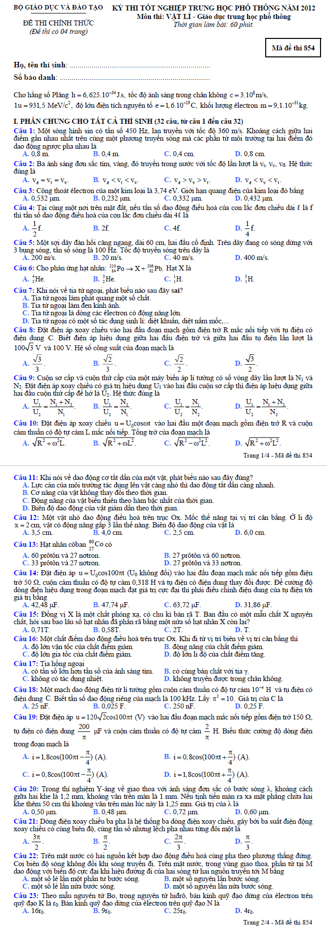 Đề thi tốt nghiệp THPT môn Vật Lí hệ Phổ thông 2012 - Mã đề 854