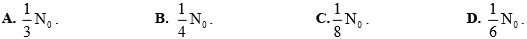 Câu 7: Ban đầu có N0 hạt nhân của một mẫu phóng xạ nguyên chất. Biết chu kì bán rã của chất phóng xạ này là T. Sau thời gian 3T, kể từ thời điểm ban đầu, số hạt nhân chưa phân rã của mẫu phóng xạ này bằng