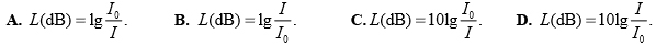 Câu 2: Tại một vị trí trong môi trường truyền âm, một sóng âm có cường độ âm I. Biết cường độ âm chuẩn là I0. Mức cường độ âm L của sóng âm này tại vị trí đó được tính bằng công thức