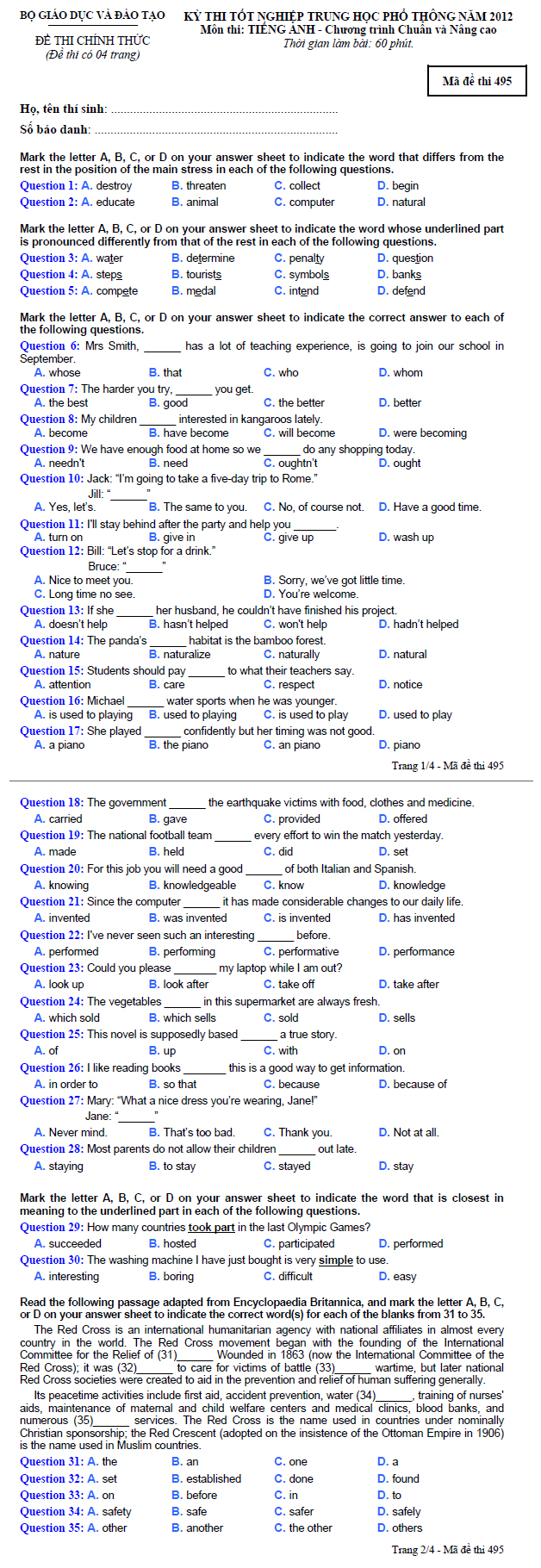 Đề thi tốt nghiệp THPT tiếng Anh chương trình chuẩn và nâng cao (2012 - Mã đề 495)