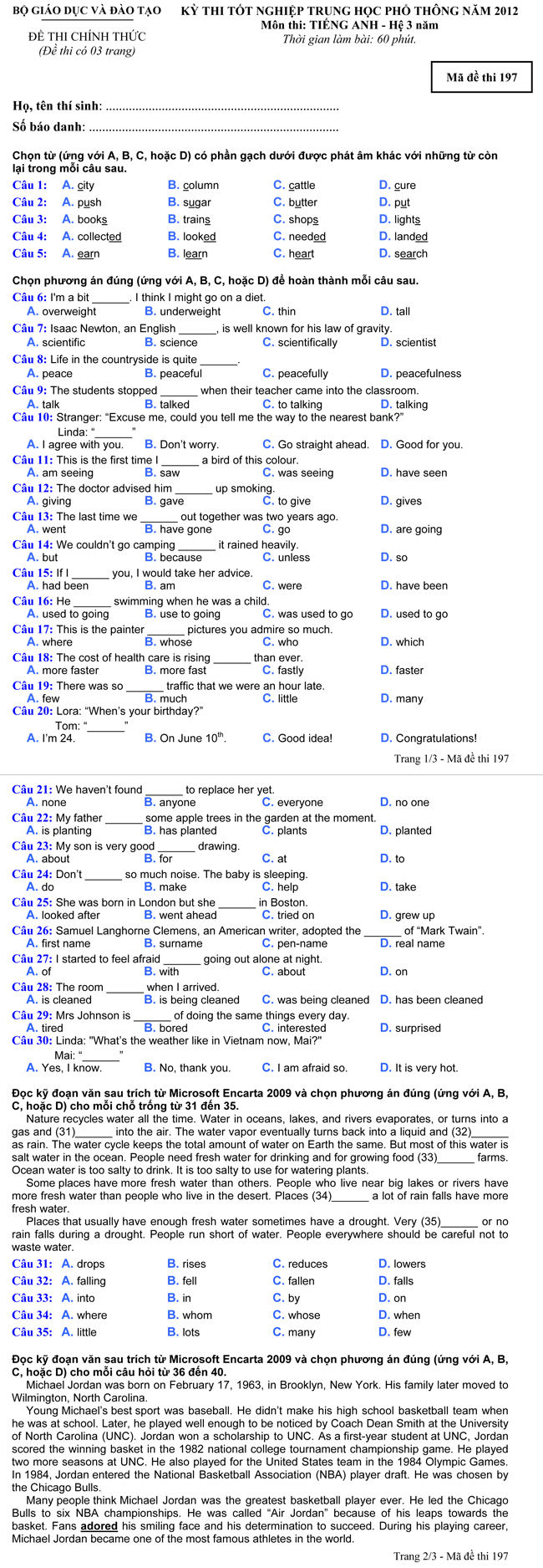 Đề thi tốt nghiệp THPT tiếng Anh năm 2012 hệ 3 năm - Mã đề thi 197
