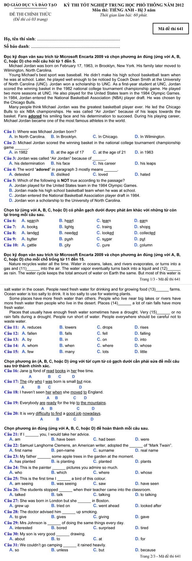 Đề thi tốt nghiệp THPT tiếng Anh năm 2012 hệ 3 năm - Mã đề thi 641