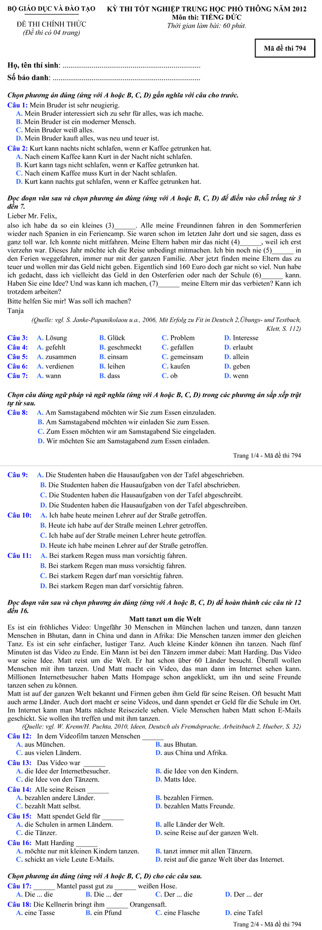 Đề thi tốt nghiệp THPT tiếng Đức hệ Phổ thông theo hình thức trắc nghiệm năm học 2012 - Mã đề thi 794