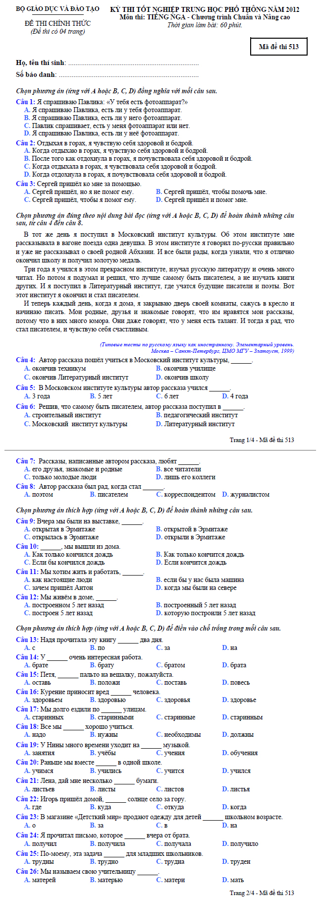 Đề thi tốt nghiệp THPT tiếng Nga chương trình chuẩn và nâng cao (2012 - Mã đề 513)
