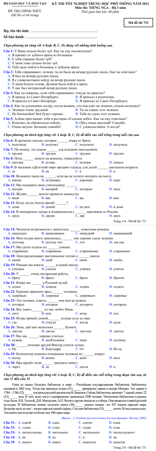 Đề thi tốt nghiệp THPT tiếng Nga năm 2012 theo hình thức trắc nghiệm dành cho hệ Phổ thông 3 năm - Mã đề thi 731