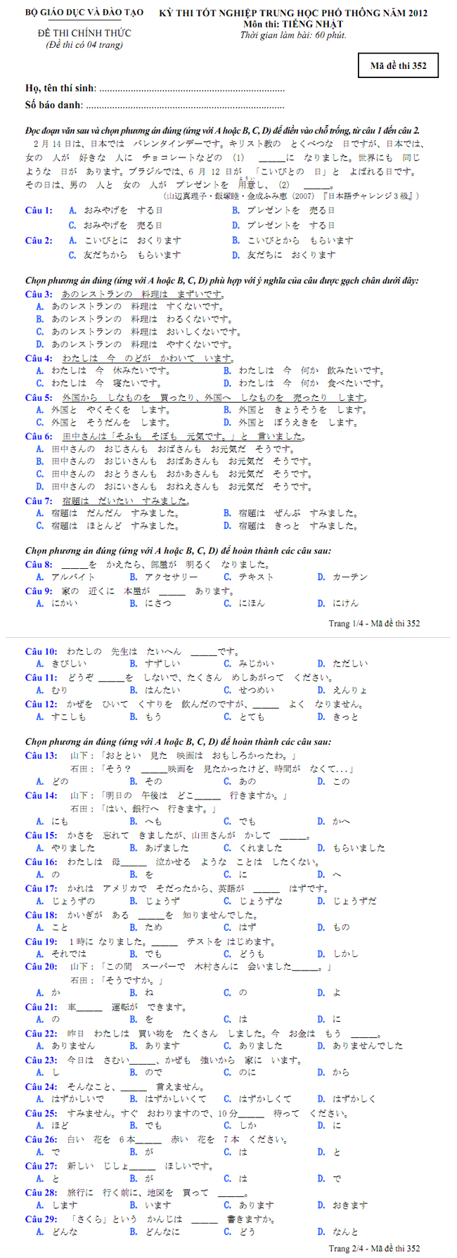 Đề thi tốt nghiệp THPT tiếng Nhật hệ Phổ thông năm 2012 - Mã đề 352