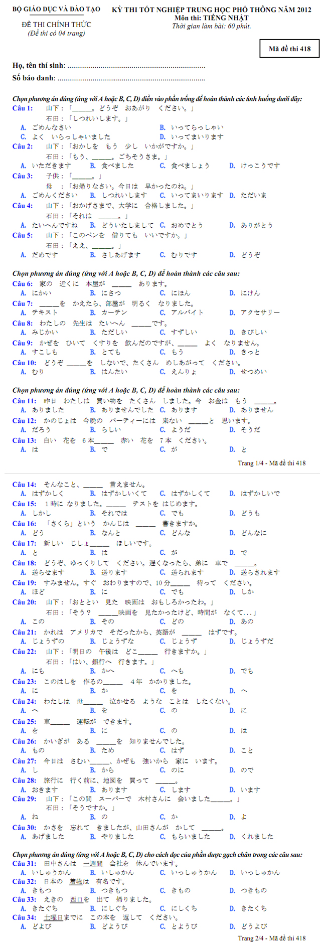 Đề thi tốt nghiệp THPT tiếng Nhật hệ Phổ thông năm 2012 - Mã đề 418