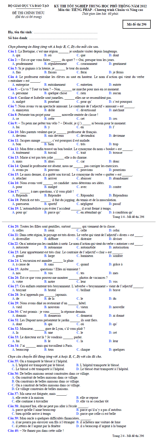Đề thi tốt nghiệp THPT tiếng Pháp năm học 2012 (mã đề thi 296) - Dành cho hệ chương trình chuẩn và nâng cao