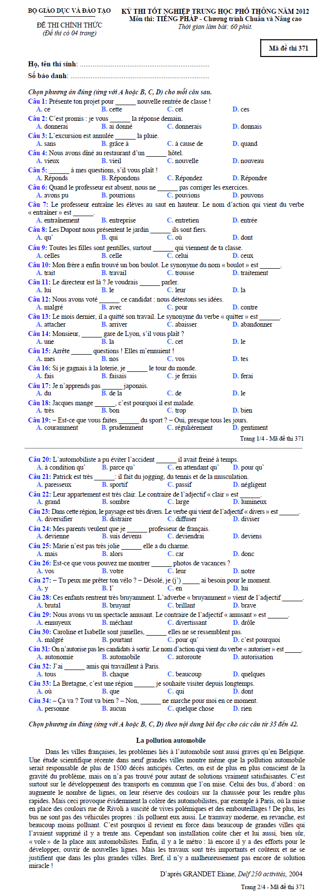 Đề thi tốt nghiệp THPT tiếng Pháp chương trình chuẩn và nâng cao (2012 - Mã đề 371)