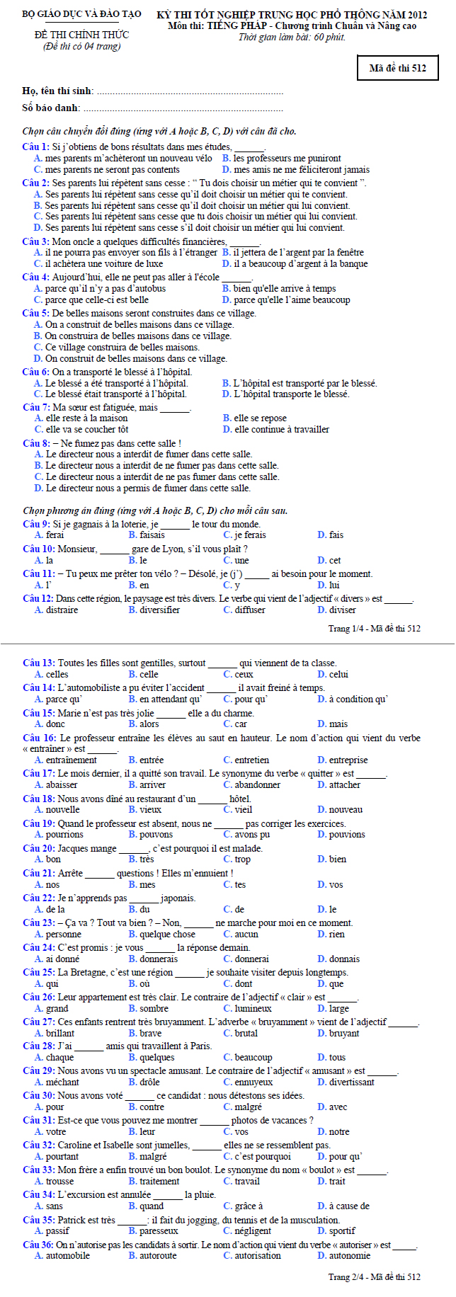 Đề thi tốt nghiệp THPT tiếng Pháp dành cho hệ chương trình chuẩn và nâng cao năm học 2012 - Mã đề thi 512